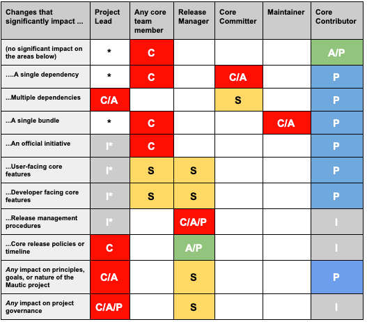 While the most common format for such matrices is RACI (Responsible, Accountable, Consulted, Informed), Mautic has decided to adopt a variation used by the Drupal community called PACSI (Perform, Accountable, Control, Suggest, Informed), which more closely matches the collaborative nature of Mautic’s culture.