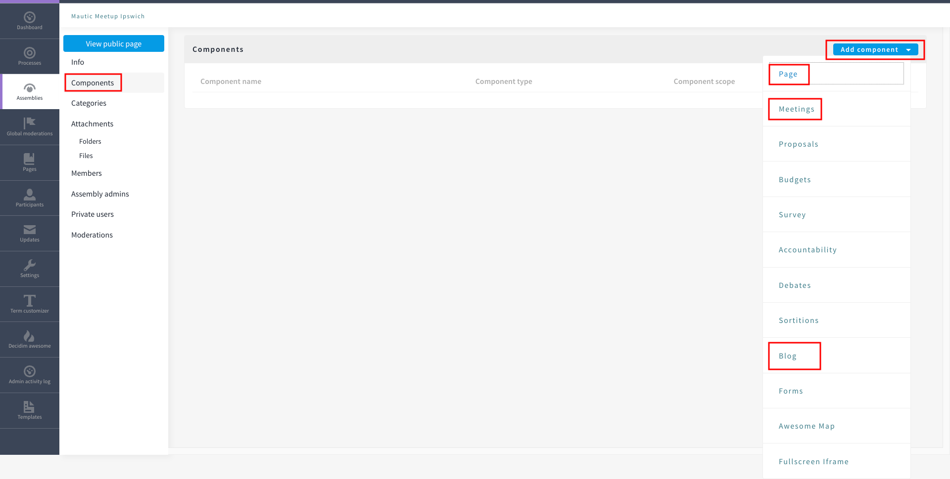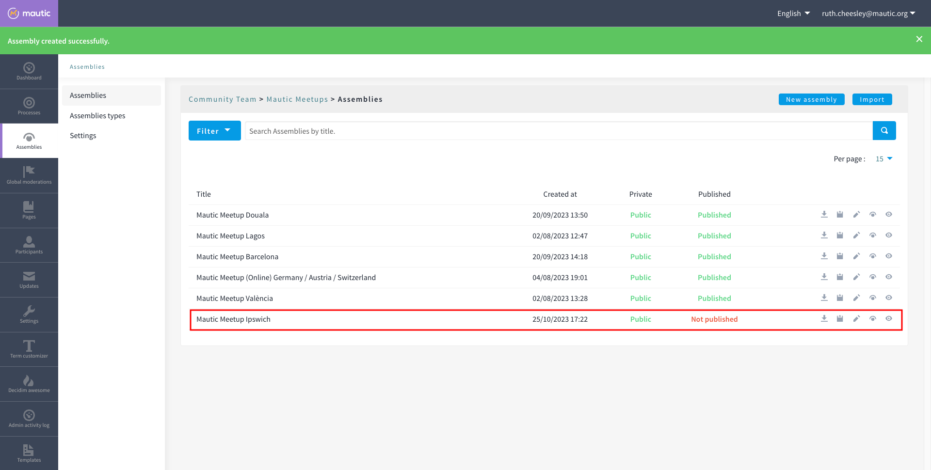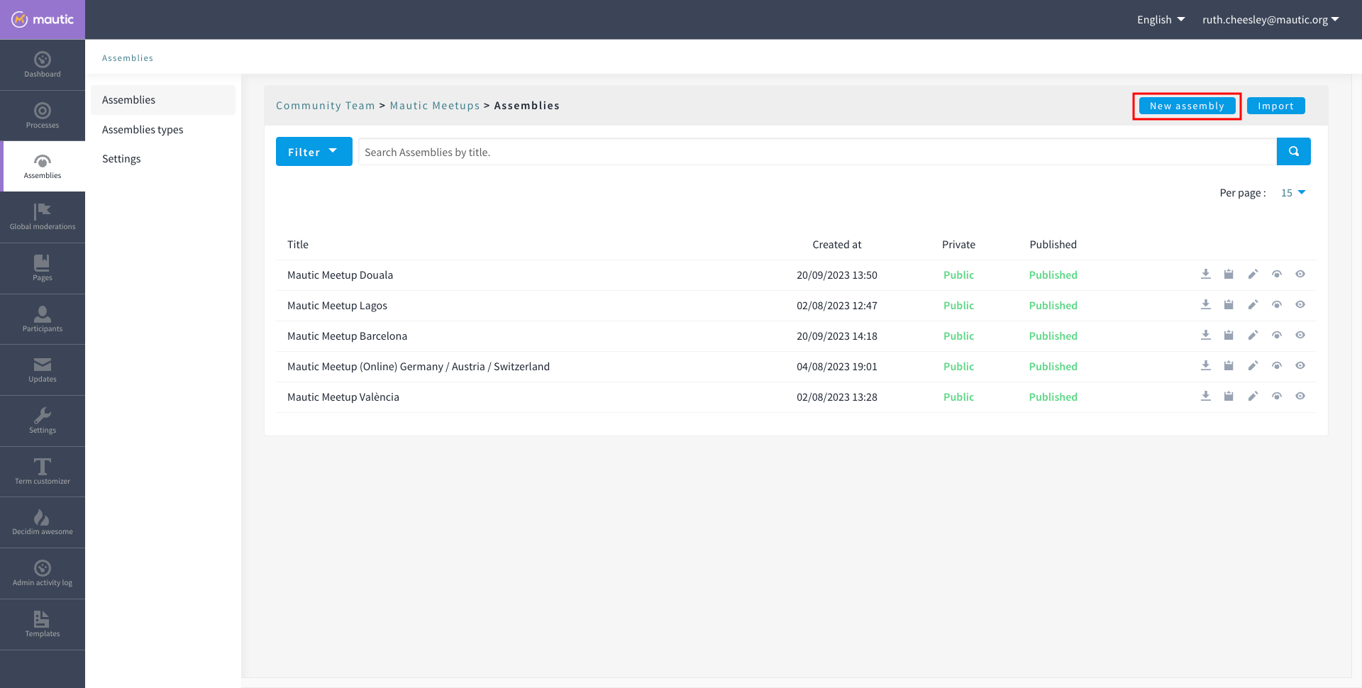 Click on ‘New assembly’. In the earlier example, when creating a new assembly within the Mautic Meetups assembly, the parent assembly - Mautic Meetups - is within the Community Team assembly. So first, navigate to the sub-assemblies of the Community Team, then the sub-assemblies of the Mautic Meetup assembly, then click ‘New assembly’.
