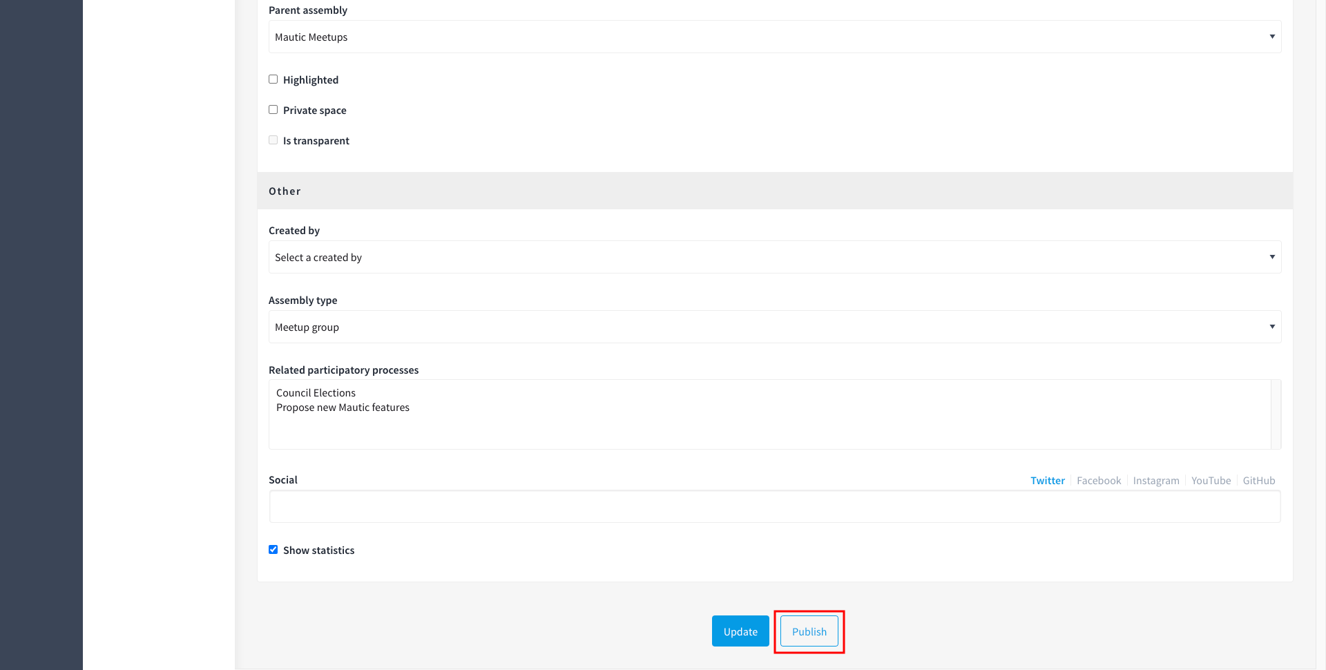 Admin panel > Participants > Participants > Show email address. The ‘Show email address’ icon resembles an open envelope.Once configured, go to ‘Info’ on the left menu when configuring the assembly, and click the ‘Publish’ button at the very bottom of the page.