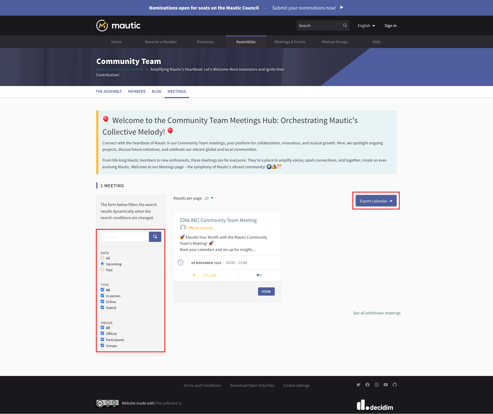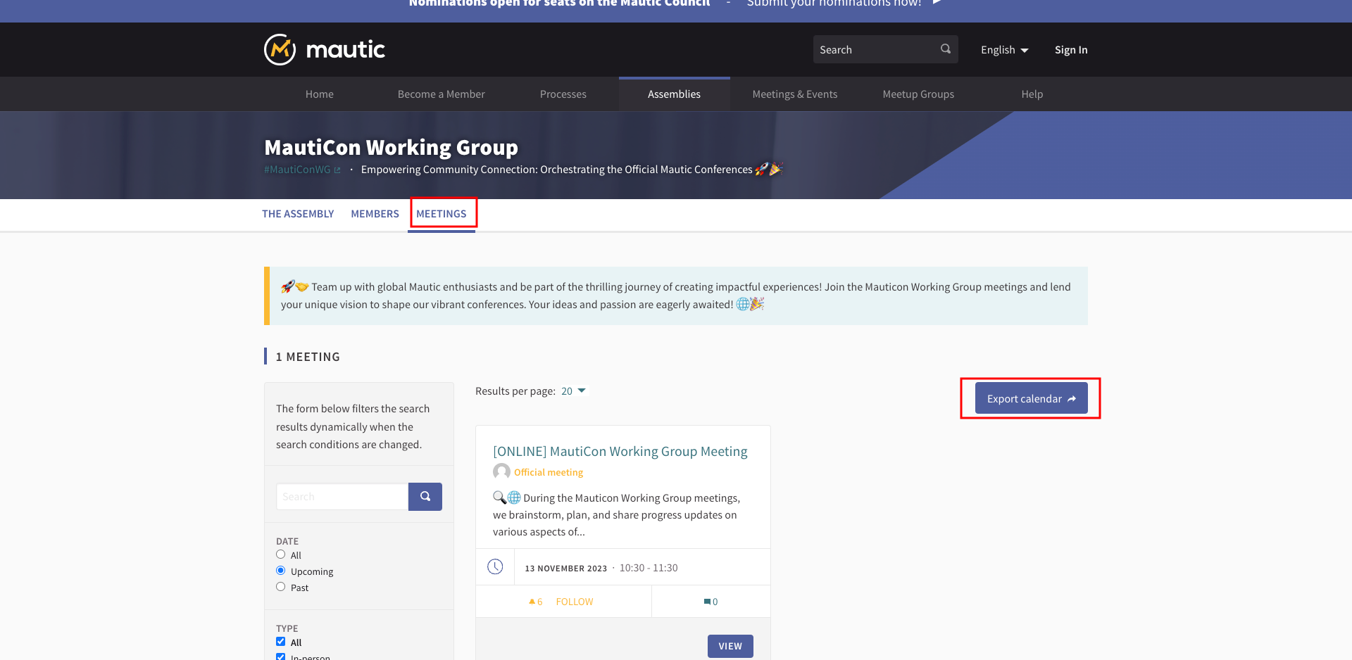 To subscribe to an Assembly’s calendar, click the ‘Meetings’ link in the Assembly menu, then click ‘Export Calendar’. This provides a link for you to add the Assembly calendar in your tool of choice.