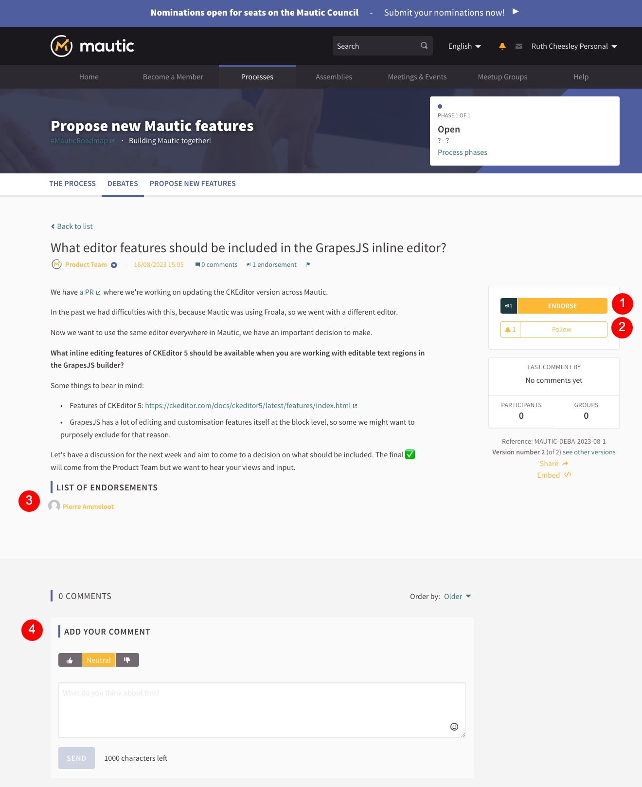 In the new features process, the component for debates is included. Any of the assemblies or processes can have the debates component available.