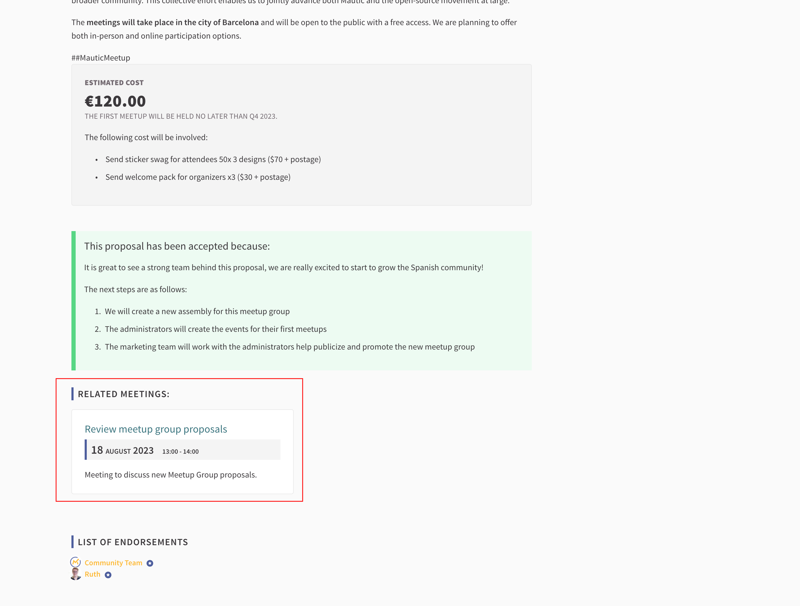 It’s also possible to add other kind of metadata to the meeting, such as what organizations have attended, how many attendees and contributions, and the considered proposals.