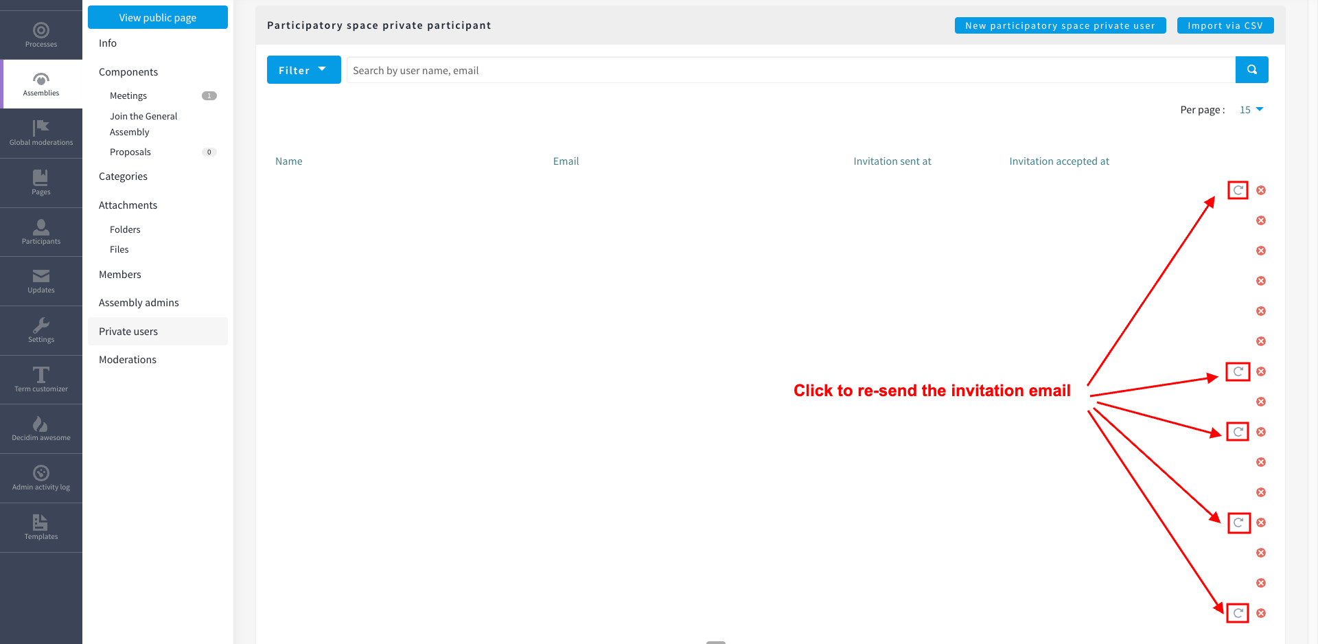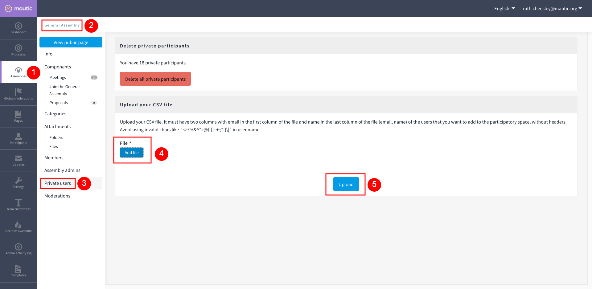 Assemblies > General Assembly > Private users > Import via CSV.